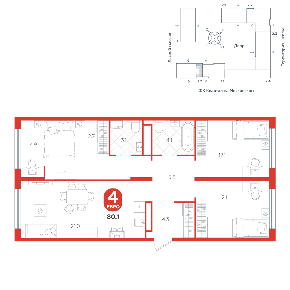 3-комнатная, 80.1 м²