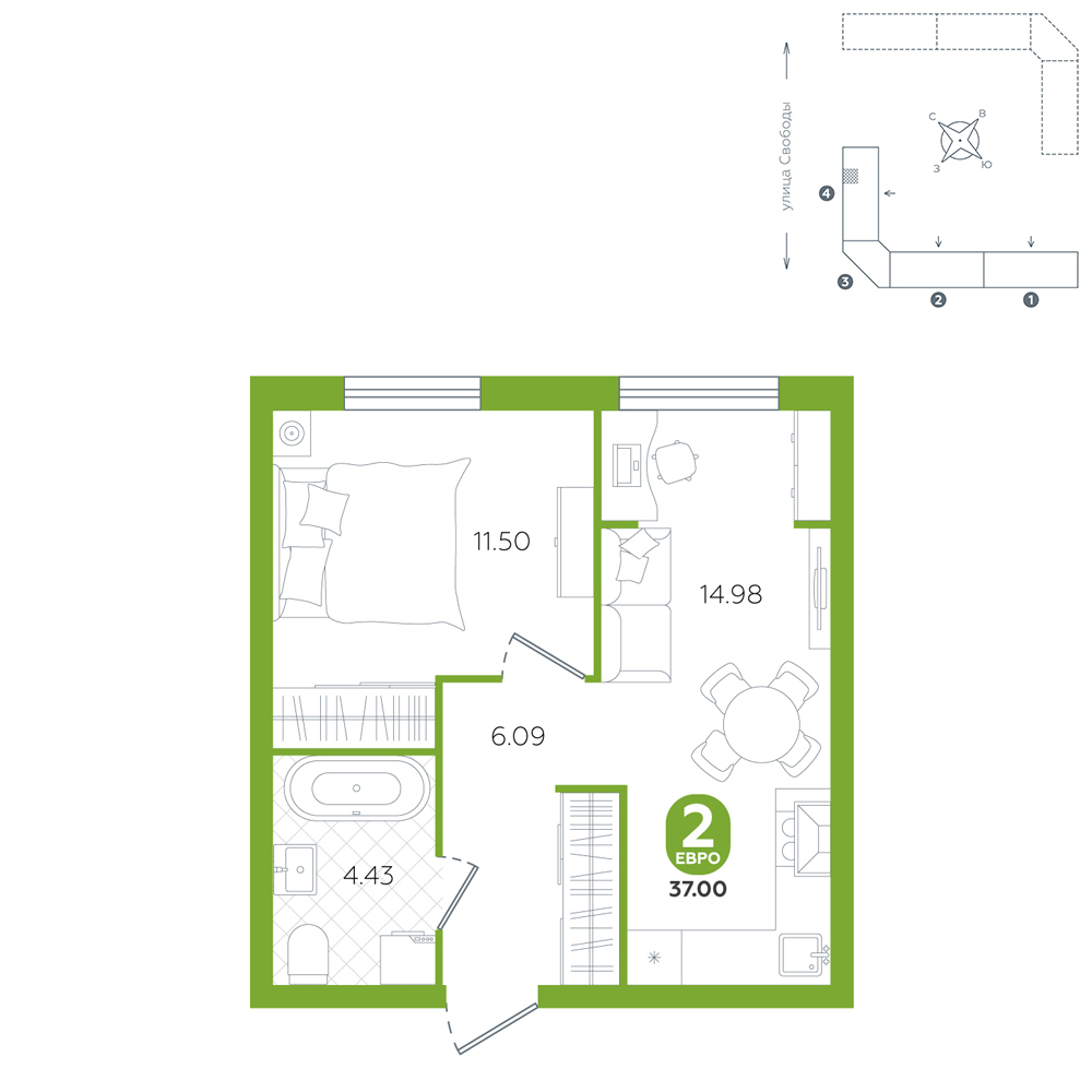 1-комнатная, 37 м²