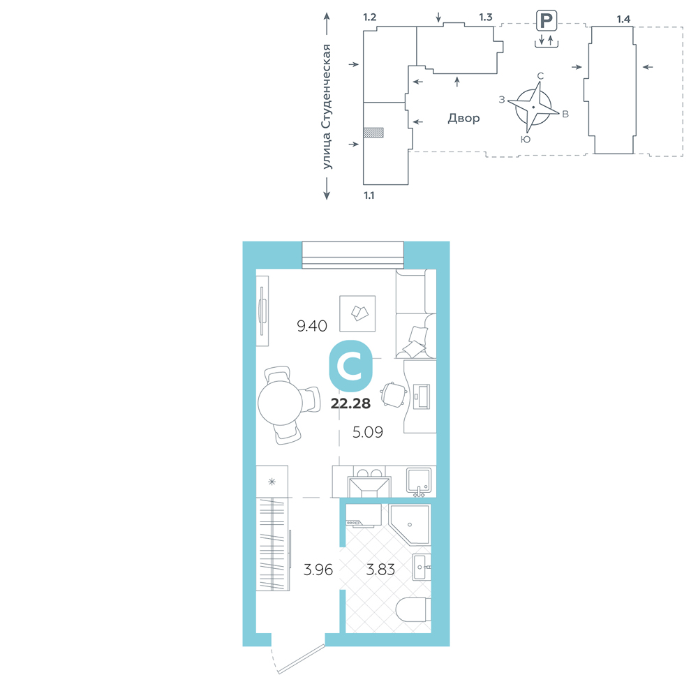 Студия, 22.3 м²
