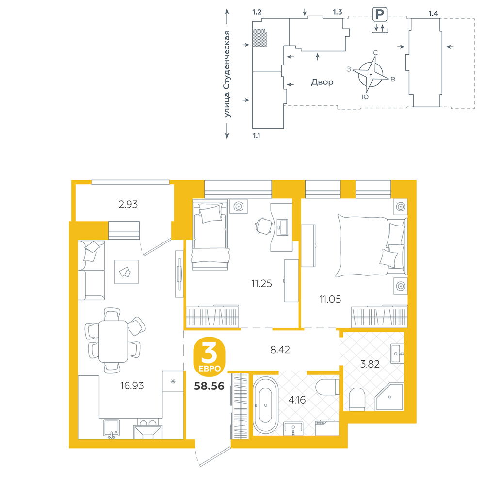 2-комнатная, 58.6 м²