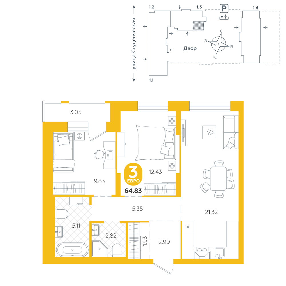 2-комнатная, 64.8 м²