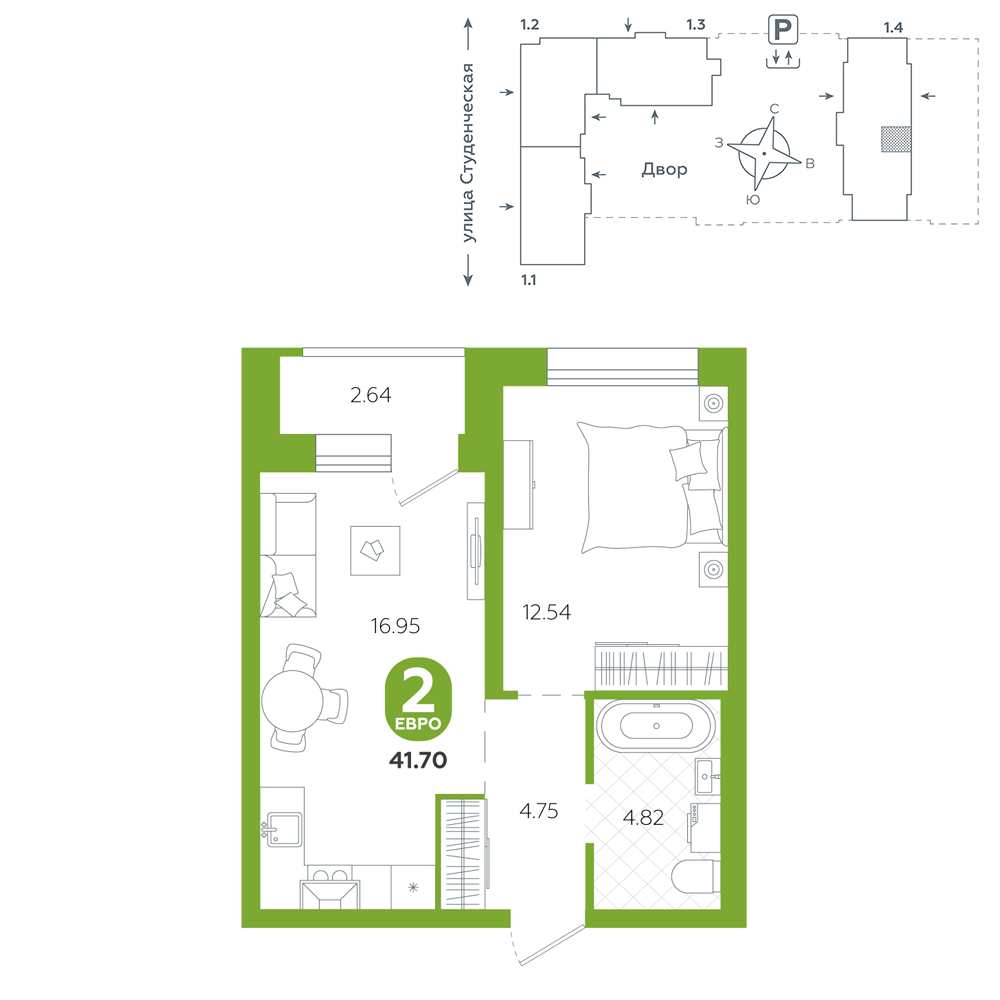 1-комнатная, 41.7 м²