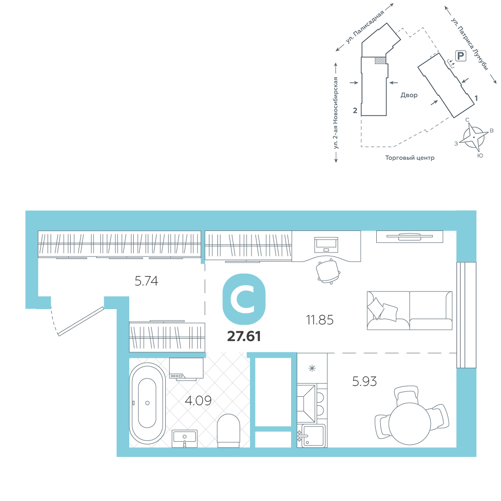 Студия, 27.6 м²
