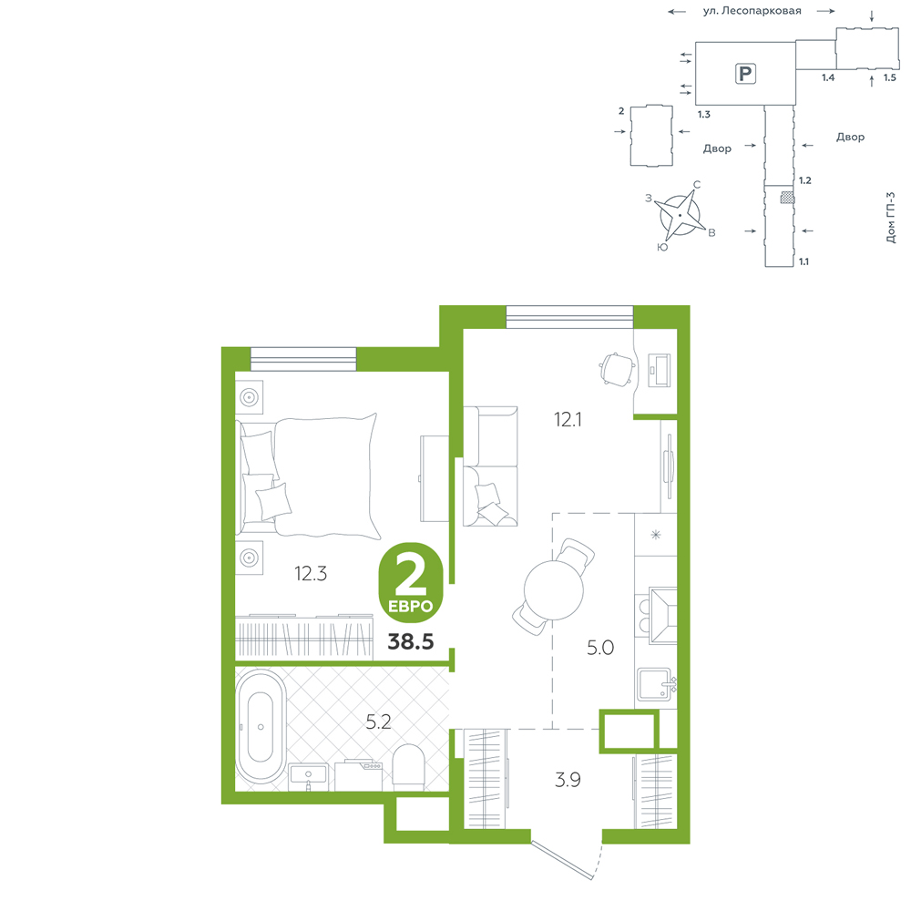 1-комнатная, 38.5 м²