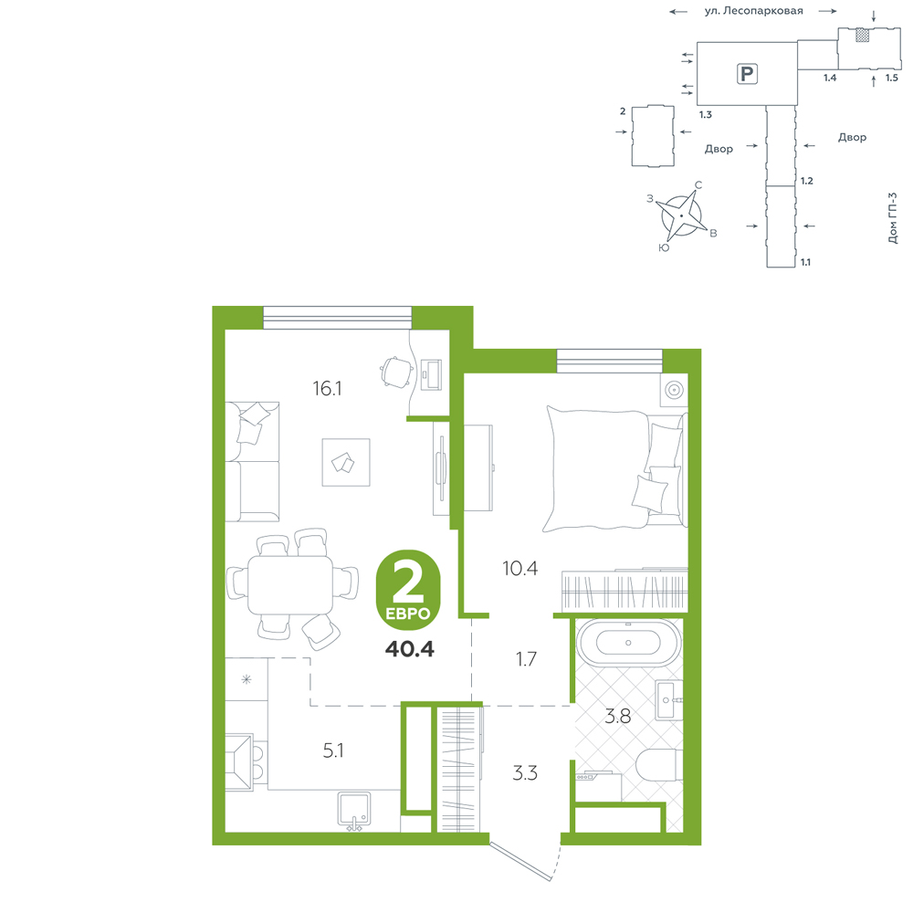 1-комнатная, 40.4 м²