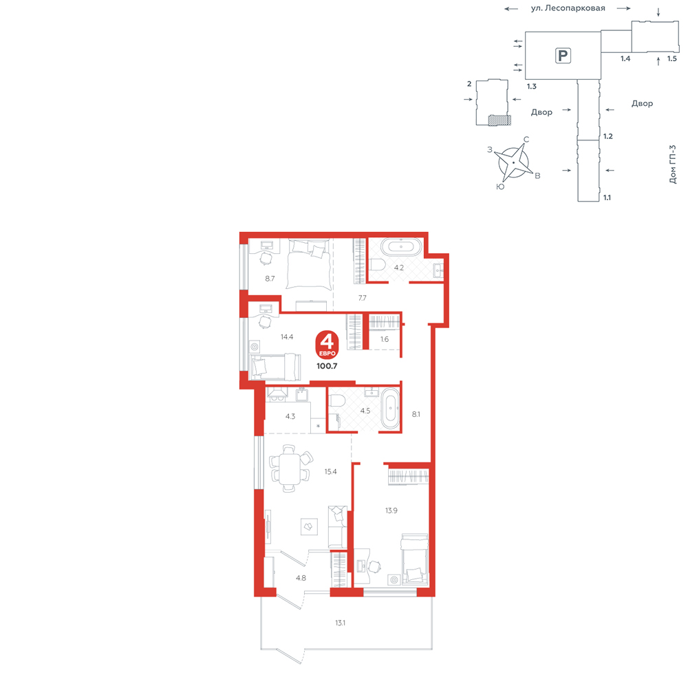 3-комнатная, 100.7 м²