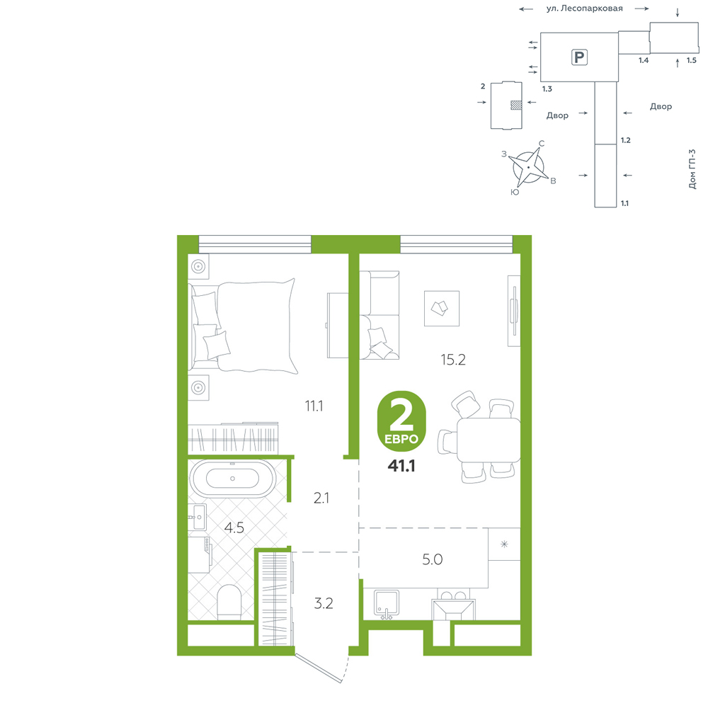 скидка 1 400 000 ₽ Окна на две стороны Вид во двор