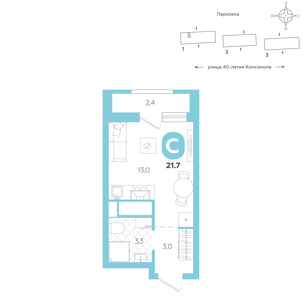 Студия, 21.7 м²
