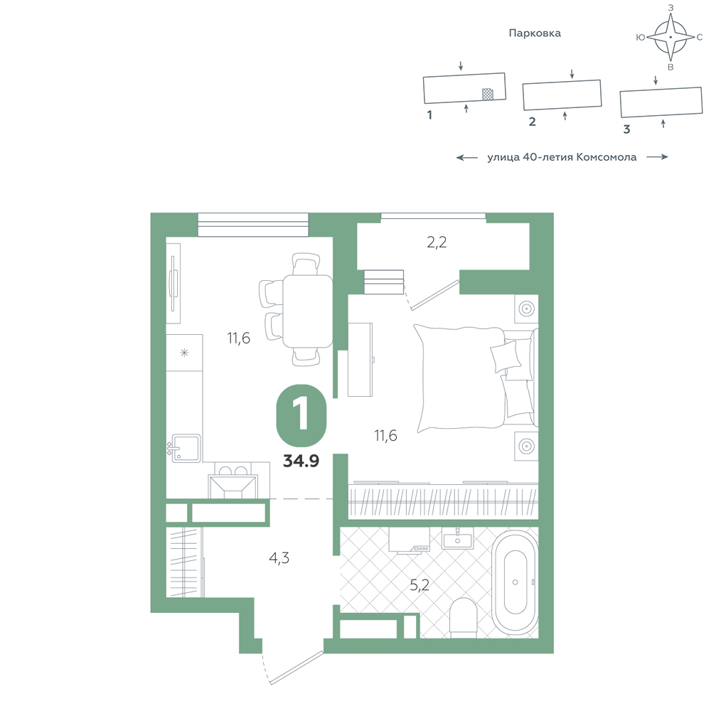1-комнатная, 34.9 м²