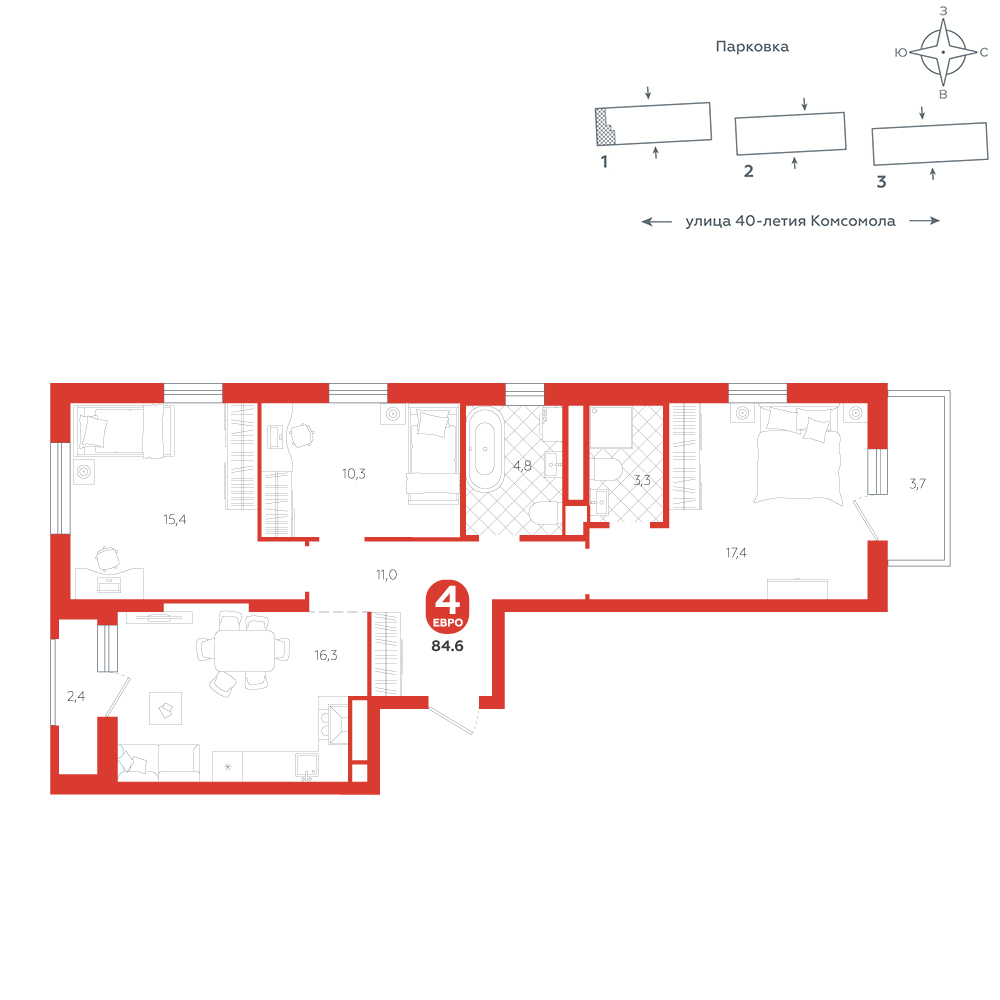 3-комнатная, 84.6 м²