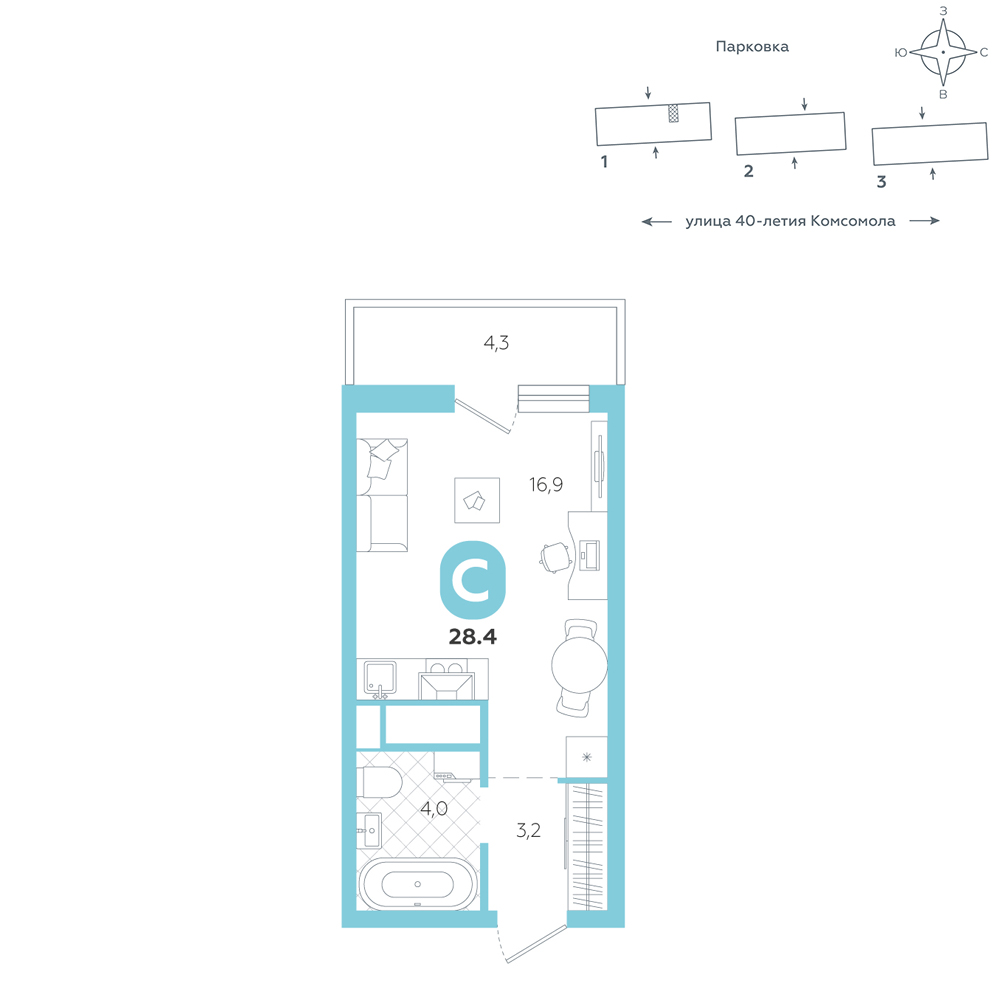 Студия, 28.4 м²