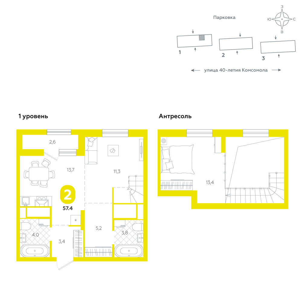 2-комнатная, 57.4 м²