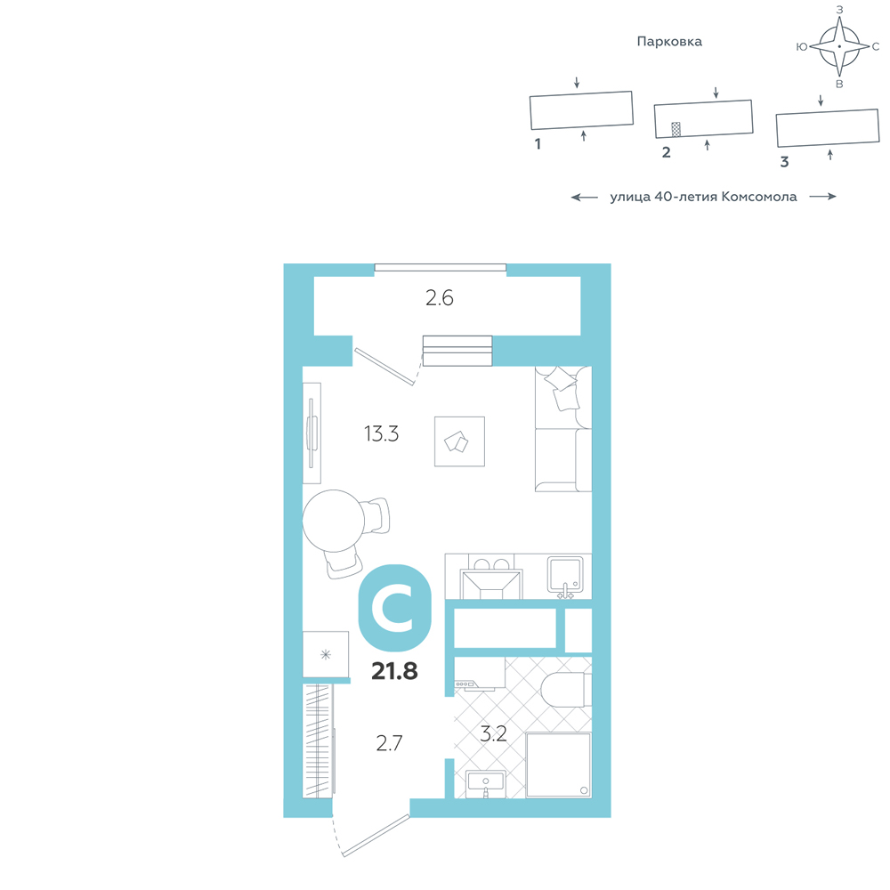 Студия, 21.8 м²