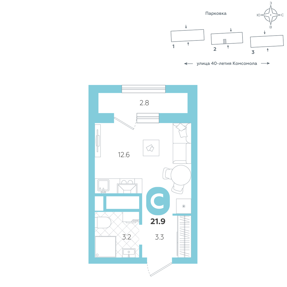 Студия, 21.9 м²
