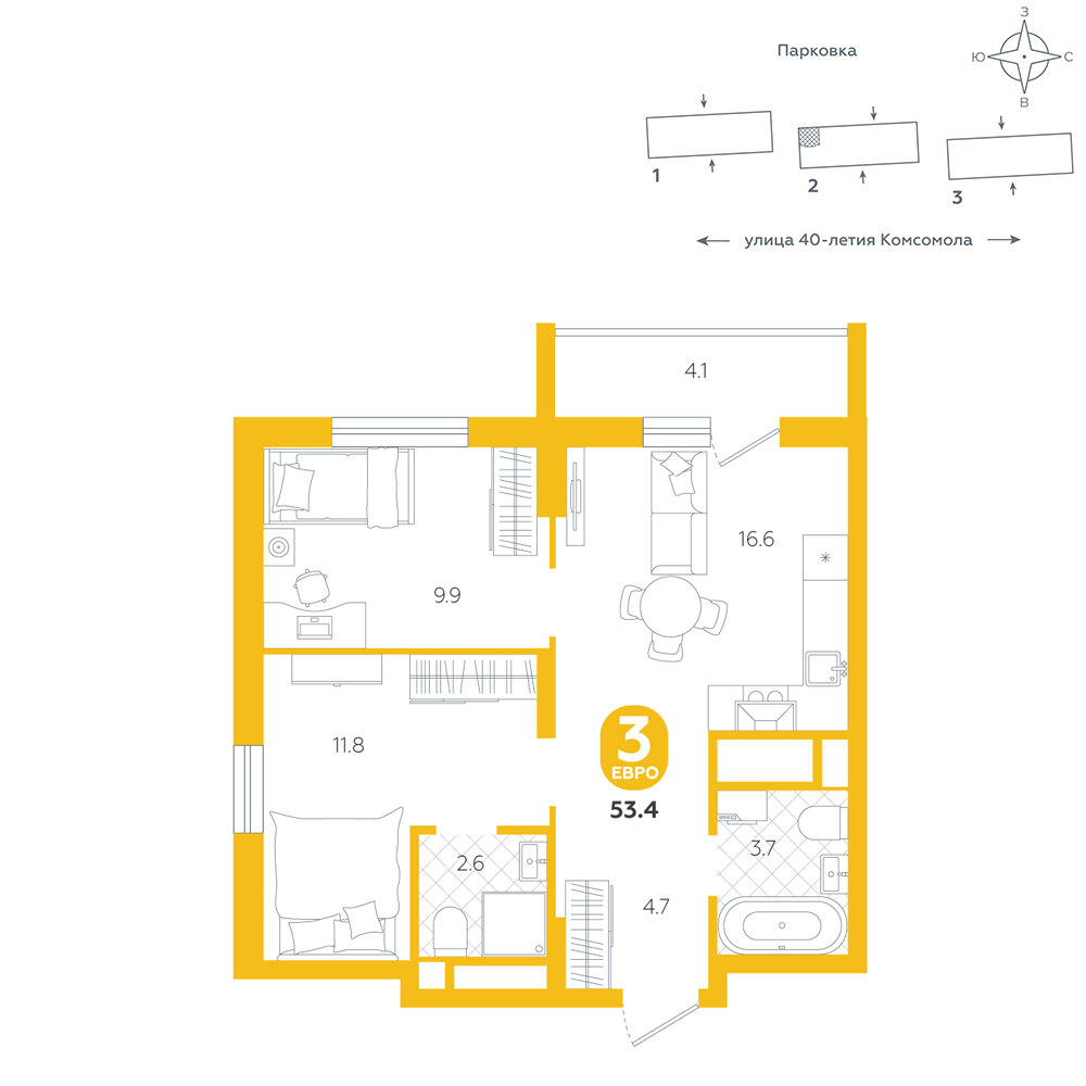 2-комнатная, 53.4 м²