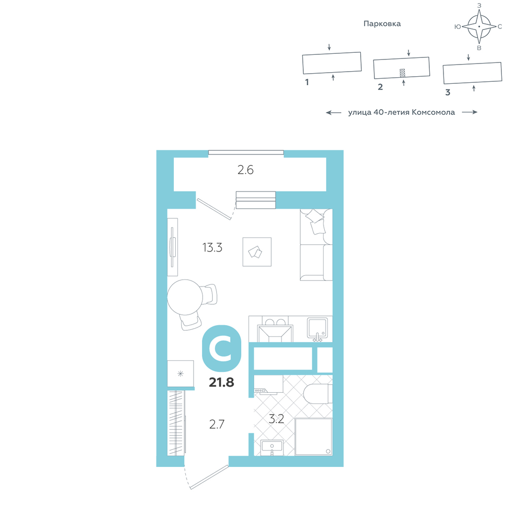 Студия, 21.8 м²