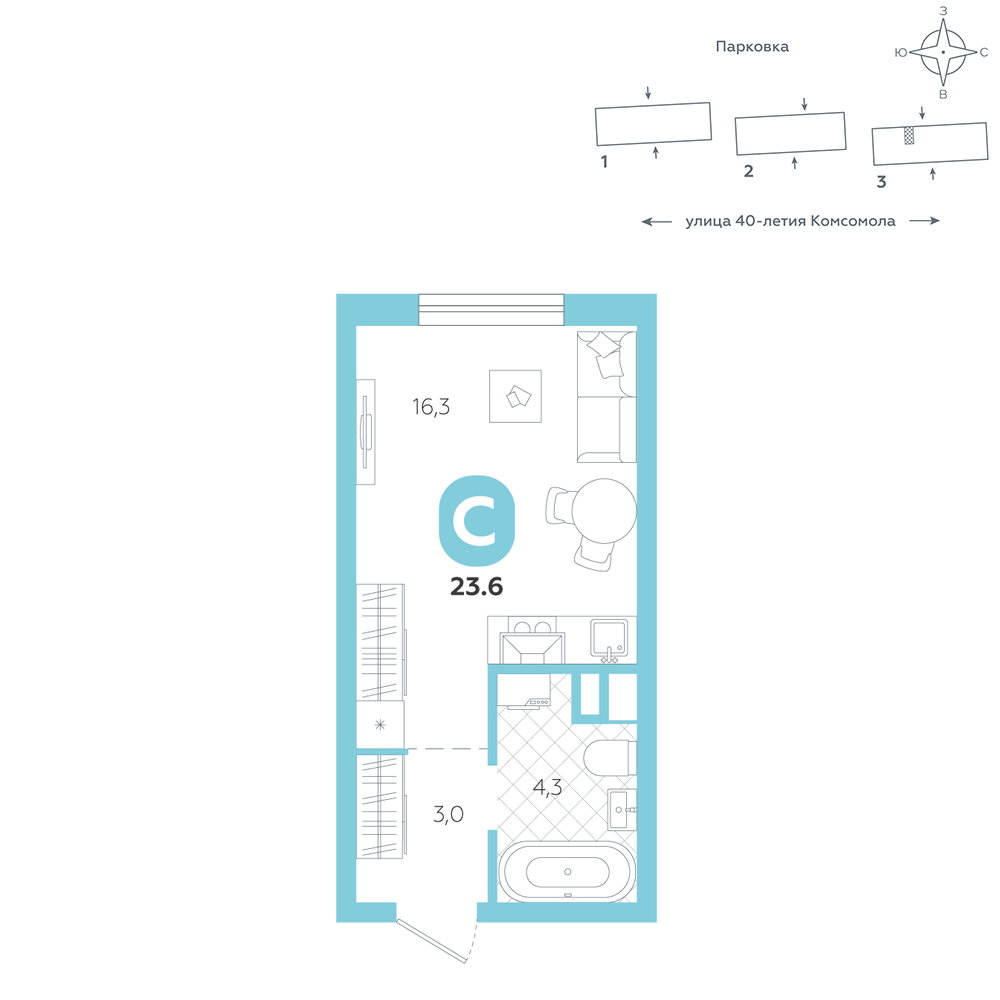 Студия, 23.6 м²