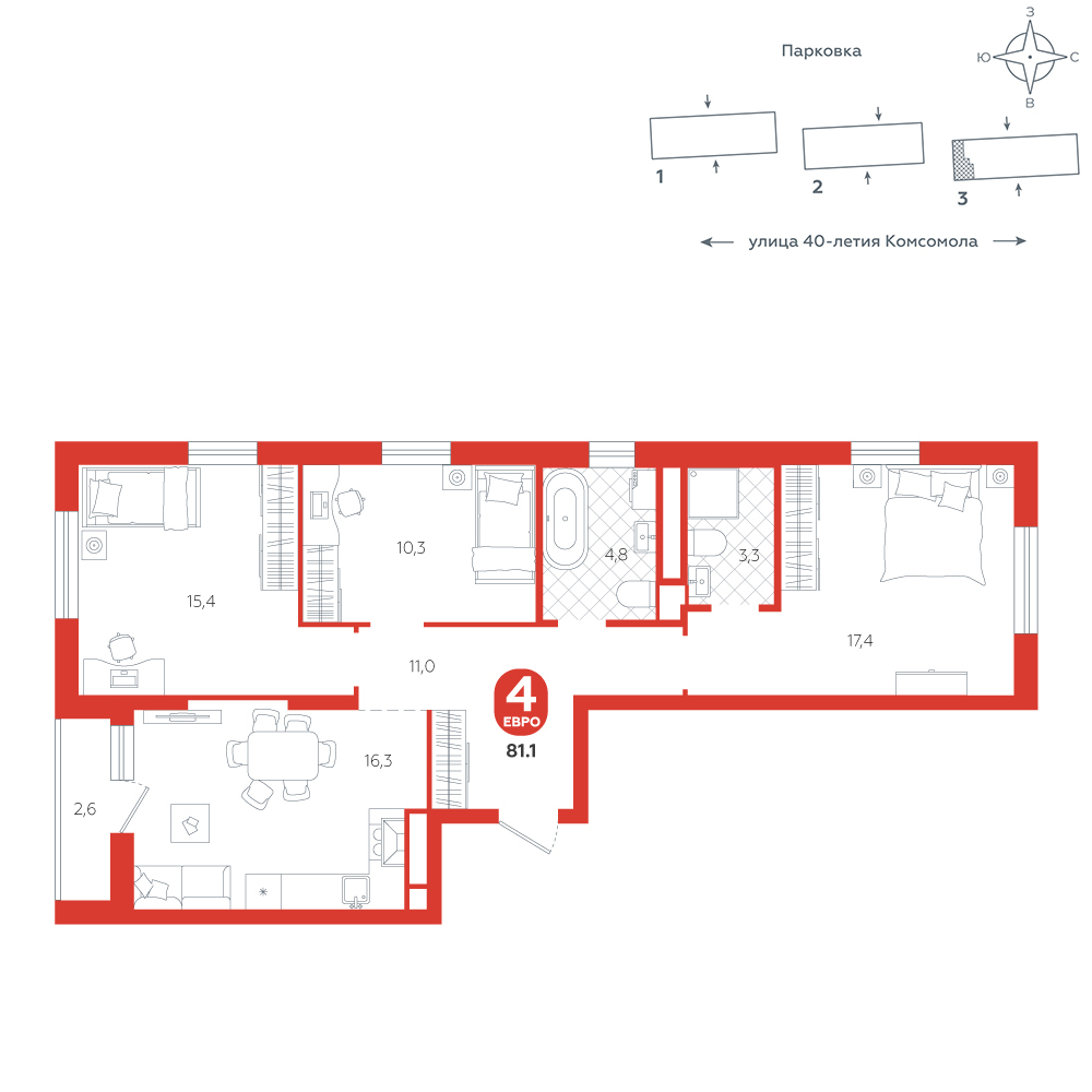 3-комнатная, 81.1 м²