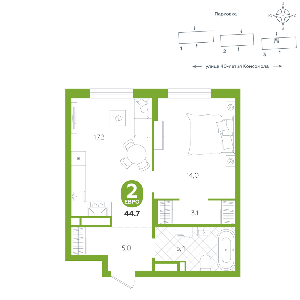 1-комнатная, 44.7 м²
