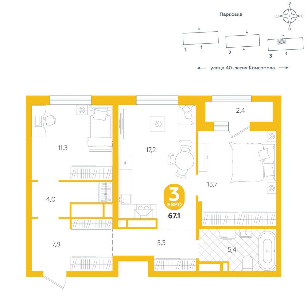 2-комнатная, 67.1 м²