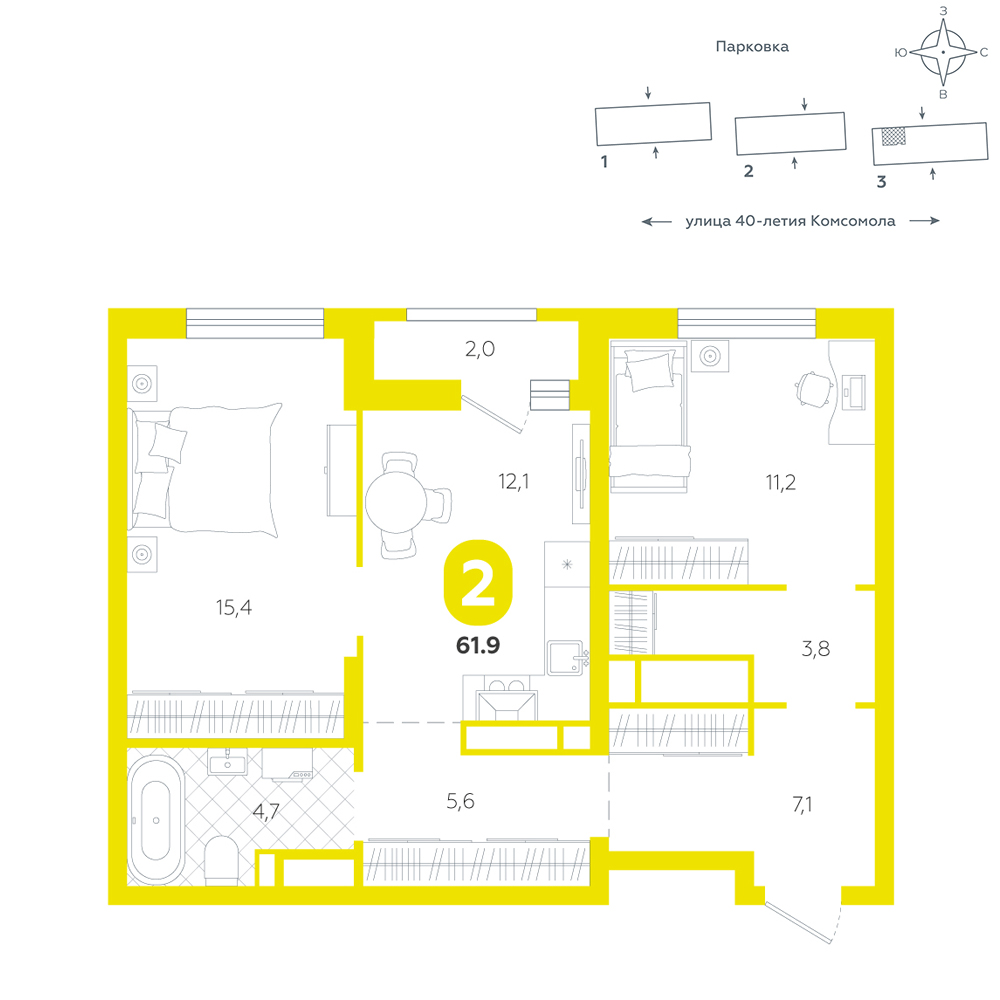 2-комнатная, 61.9 м²
