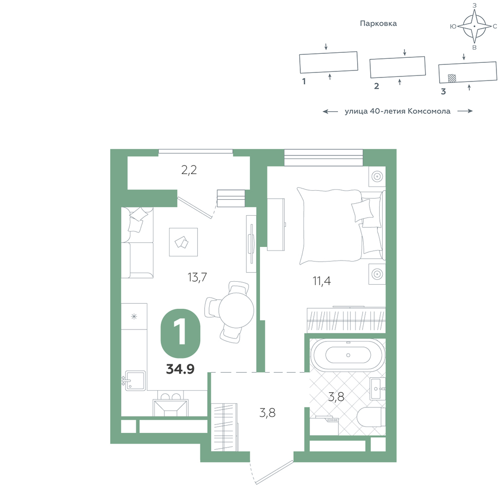 1-комнатная, 34.9 м²