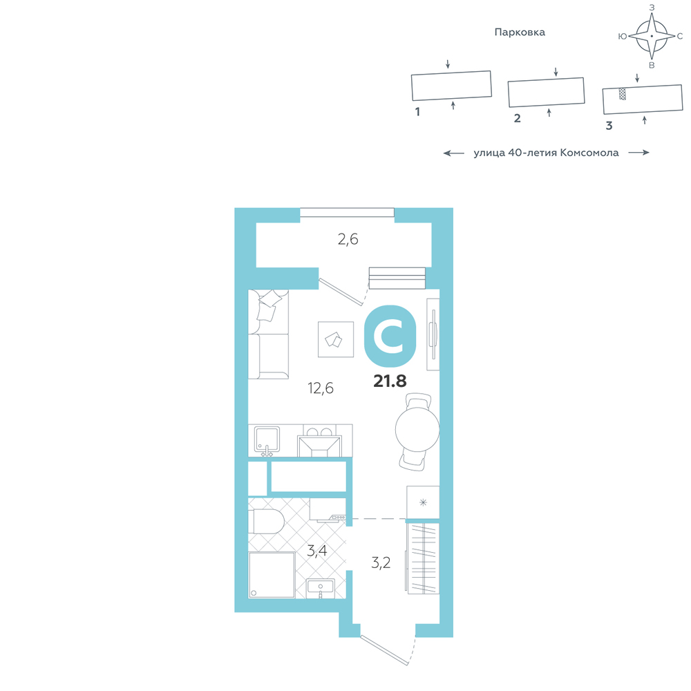 Студия, 21.8 м²