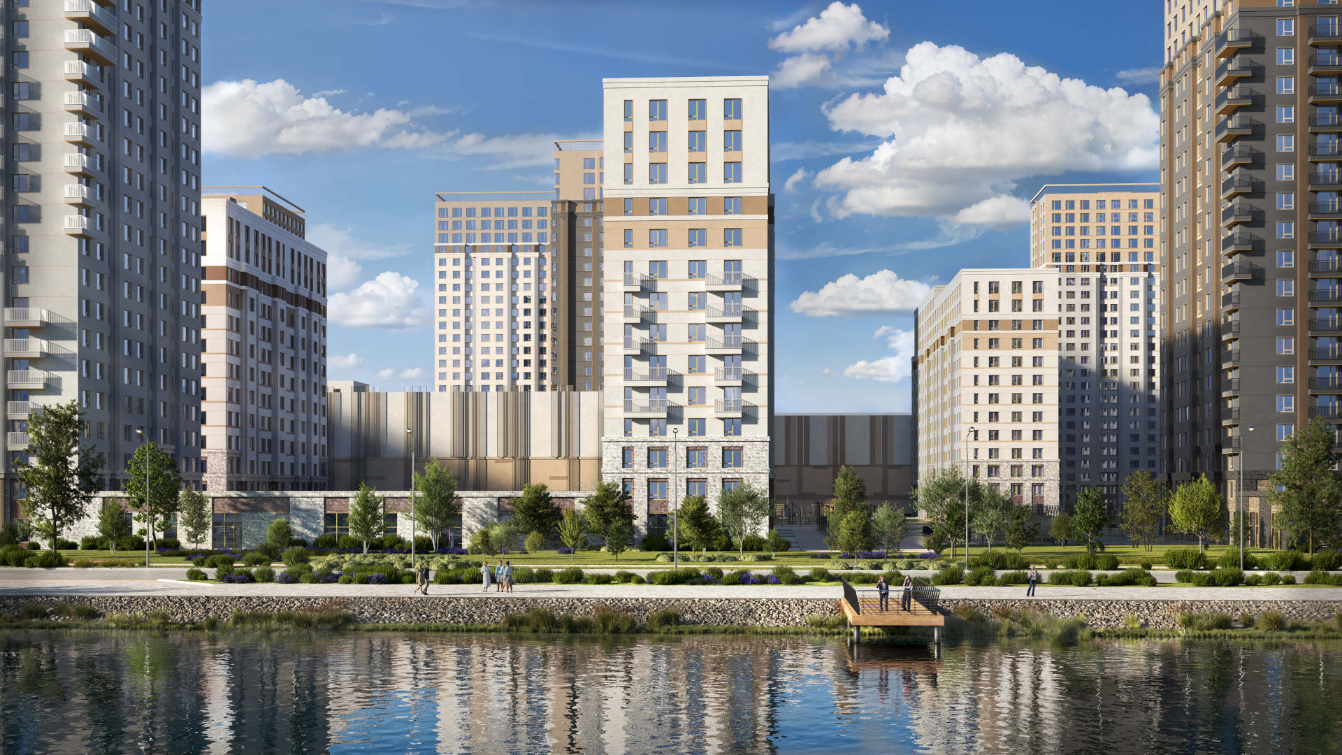 Цветовое решение зданий исполнено в теплой цветовой гамме, гармонирующей с природным окружением, наполняя пространство ощущением легкости.