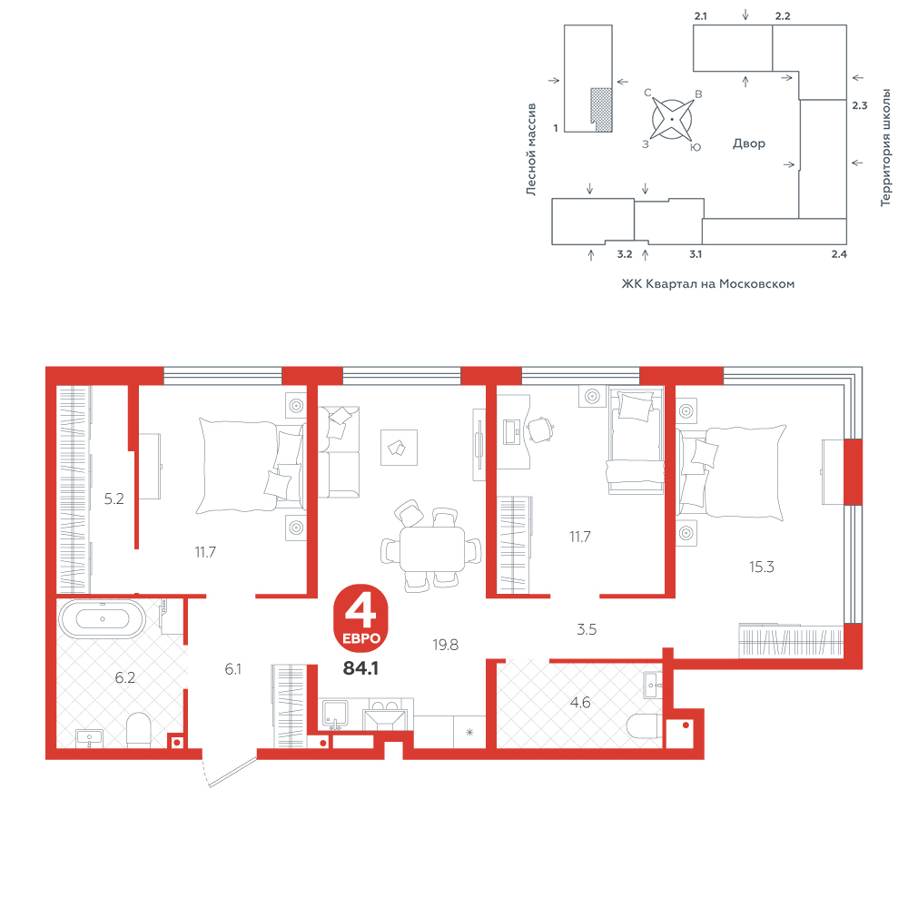3-комнатная, 84.1 м²
