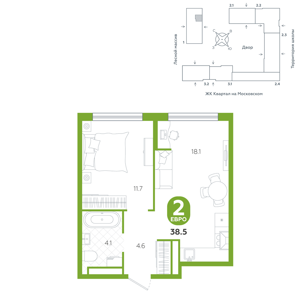 1-комнатная, 38.5 м²