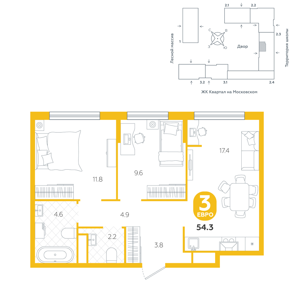 2-комнатная, 54.3 м²