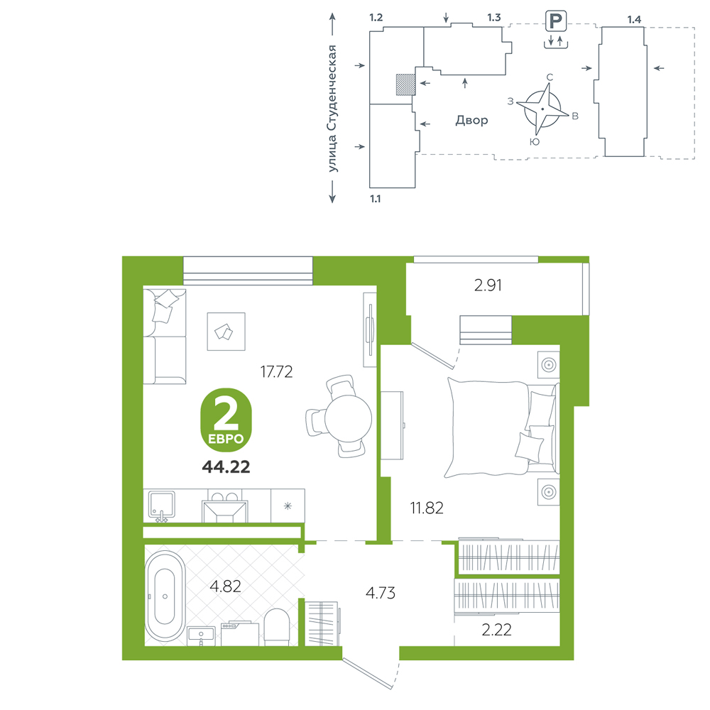 1-комнатная, 44.2 м²