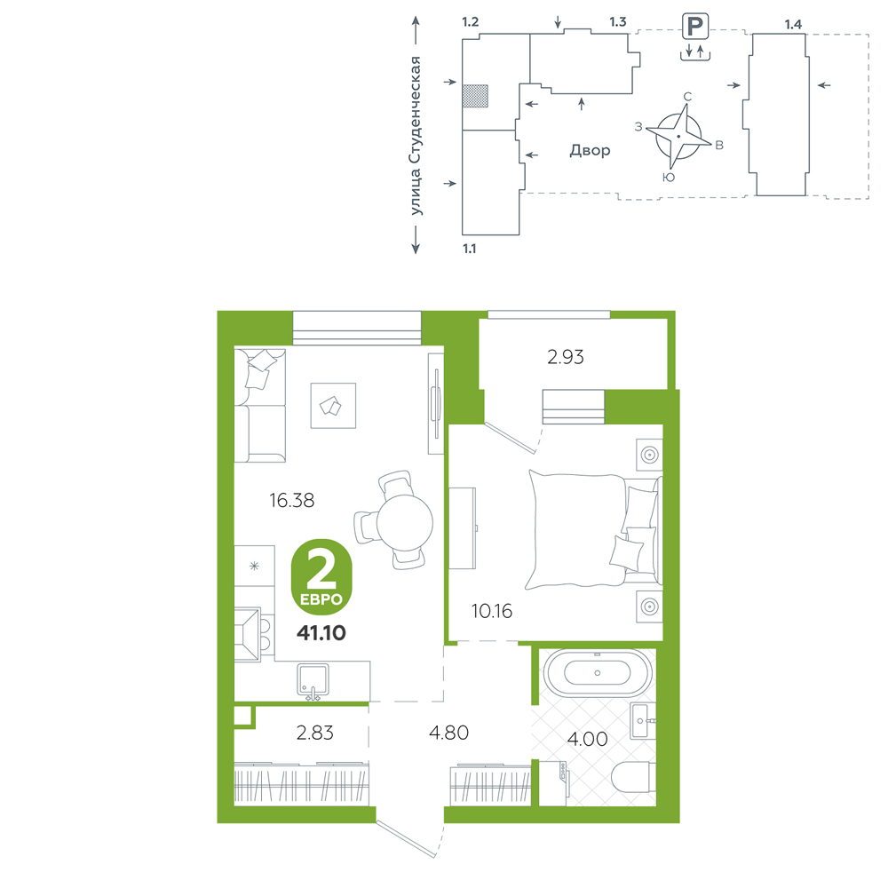 1-комнатная, 41.1 м²