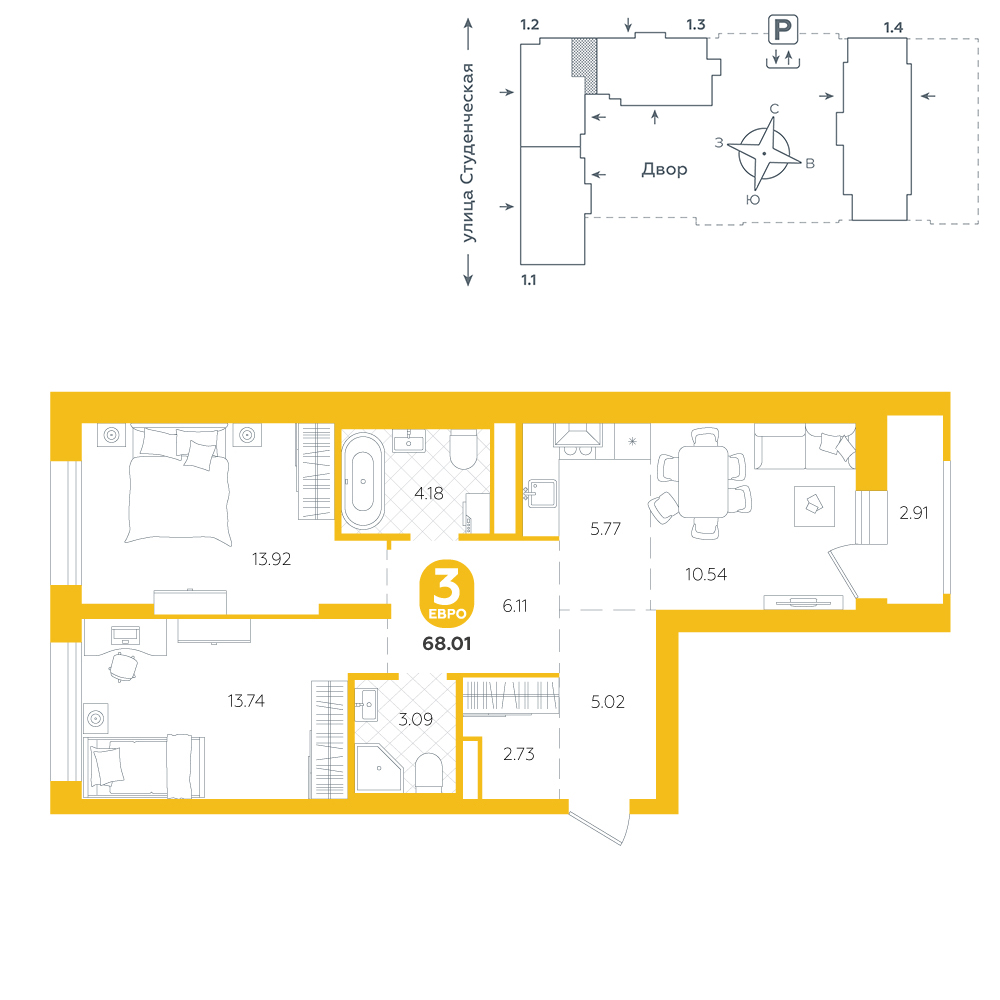 2-комнатная, 68.8 м²