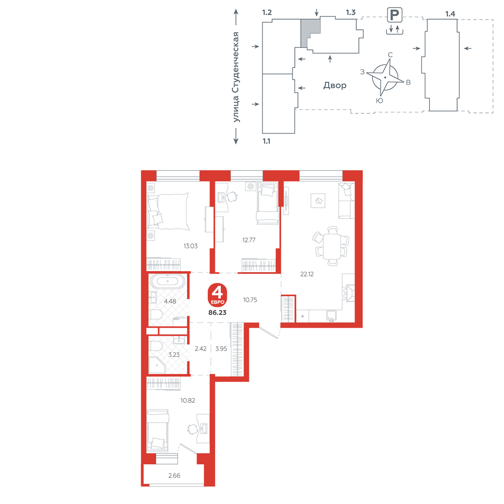 3-комнатная, 86.2 м²