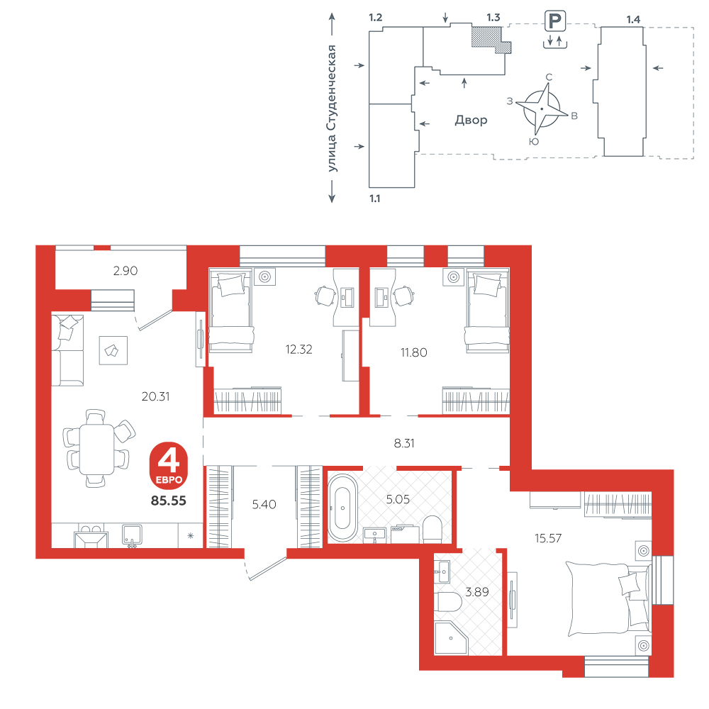 3-комнатная, 85.5 м²