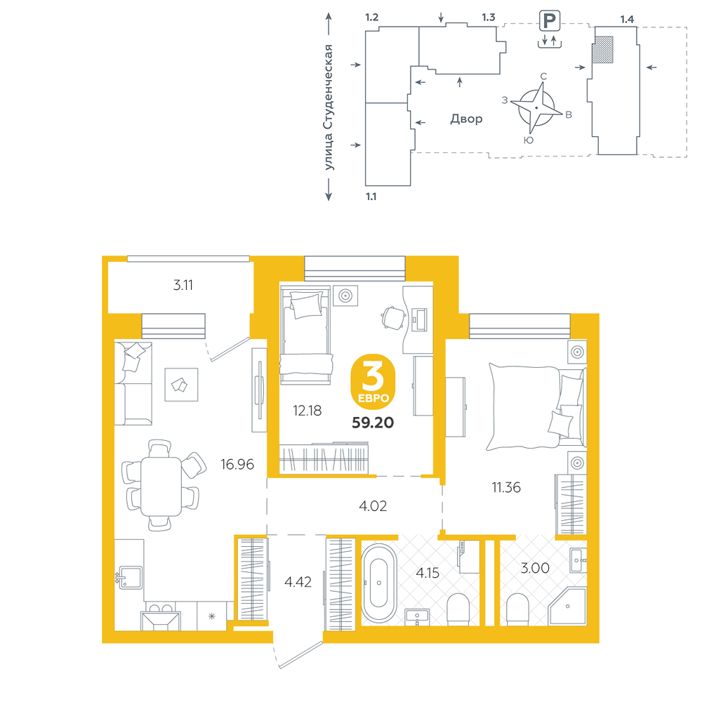 2-комнатная, 59.2 м²