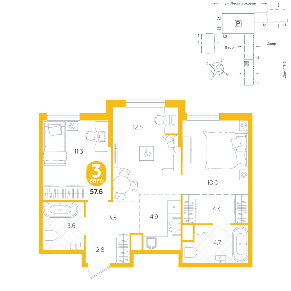 2-комнатная, 57.6 м²