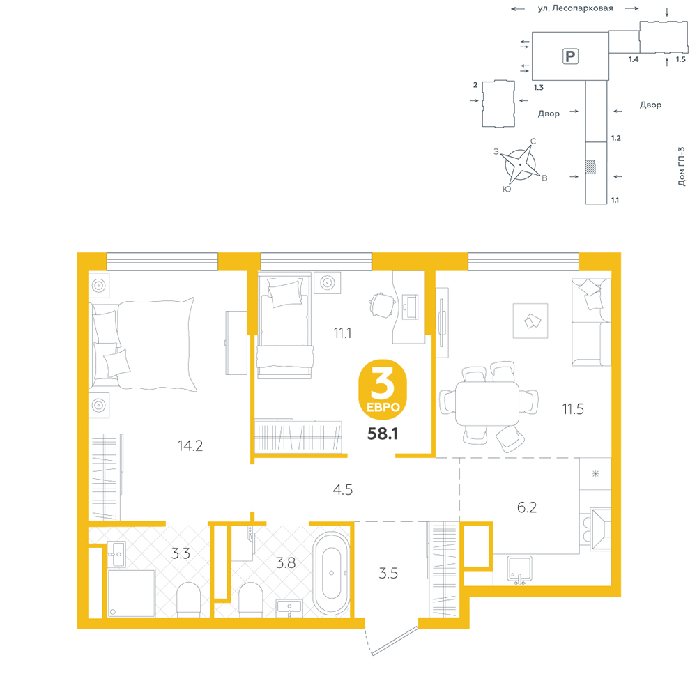 2-комнатная, 58.1 м²