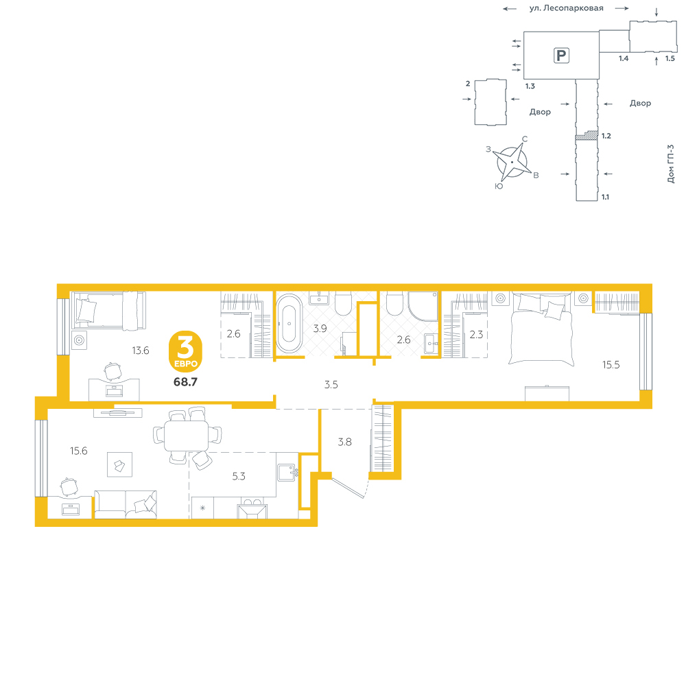 2-комнатная, 68.7 м²