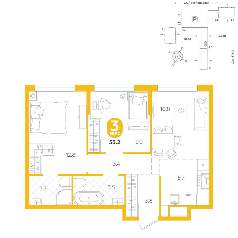 2-комнатная, 53.2 м²