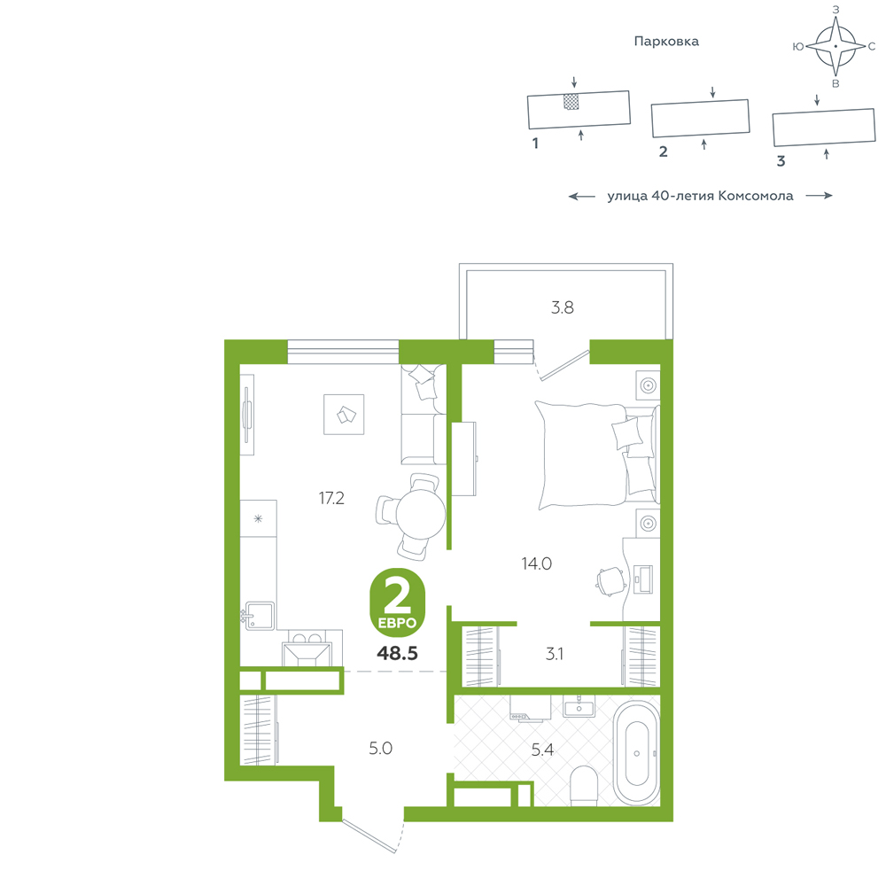 1-комнатная, 48.5 м²