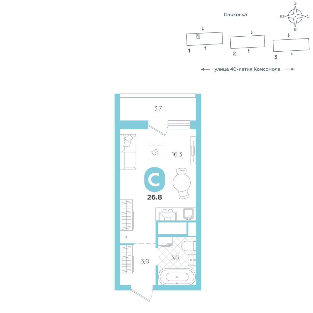 Студия, 26.8 м²