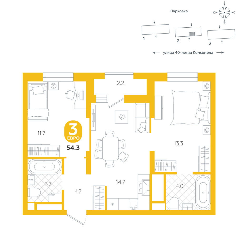 2-комнатная, 54.3 м²