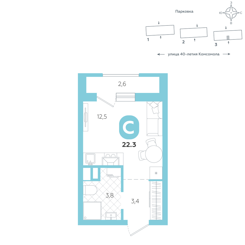 Студия, 22.3 м²
