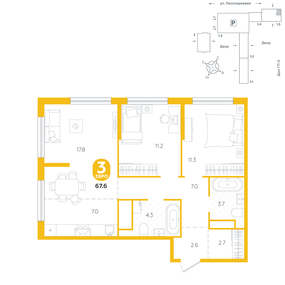 2-комнатная, 67.6 м²