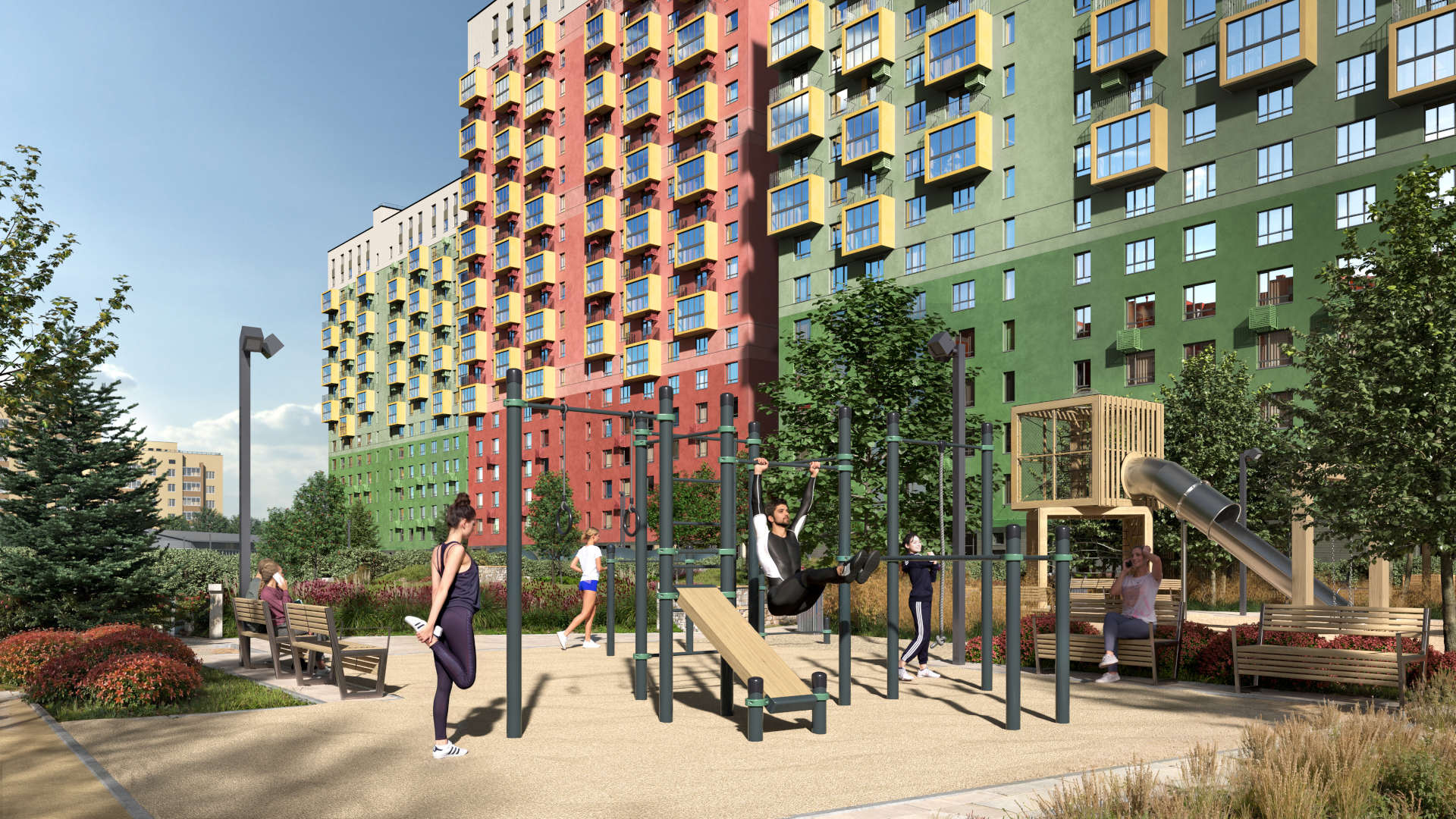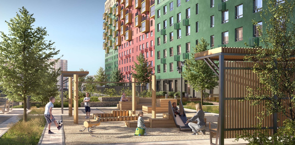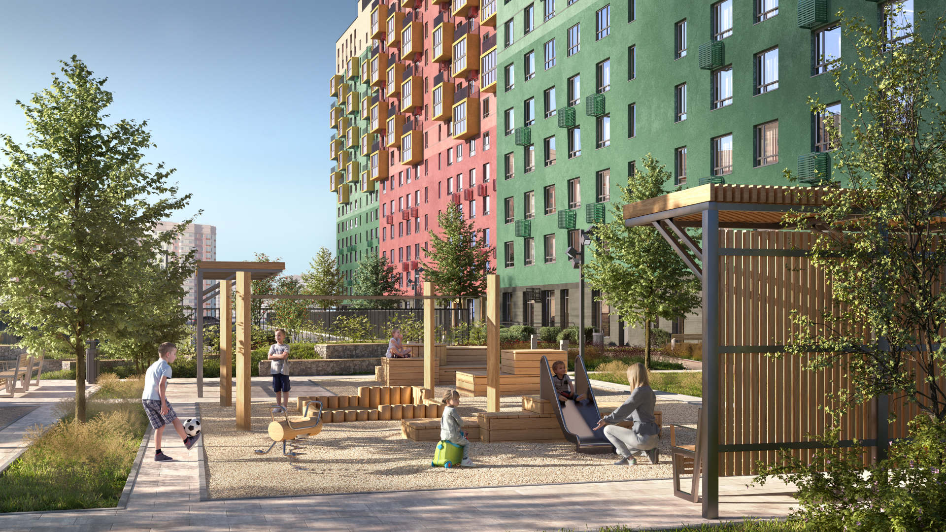 «Комсомольский» находится в районе ЖБИ и спроектирован по принципу «15-минутного города». Детские сады, школы, спортзалы и центр культуры — все рядом.